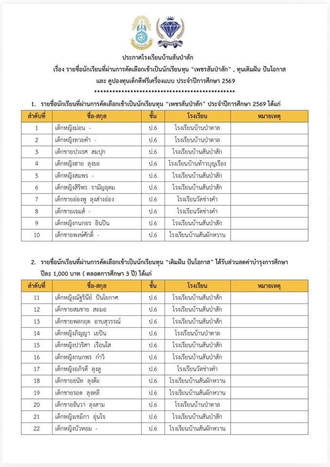 ประกาศผลการคัดเลือกนักเรียนทุนเพชรสันป่าสัก , นักเรียนทุนเติมฝัน ปันโอกาส และนักเรียนทุนคูปองเด็กดี ฟรีเครื่องแบบ ระดับชั้นมัธยมศึกษาปีที่ 1 ปีการศึกษา 2569