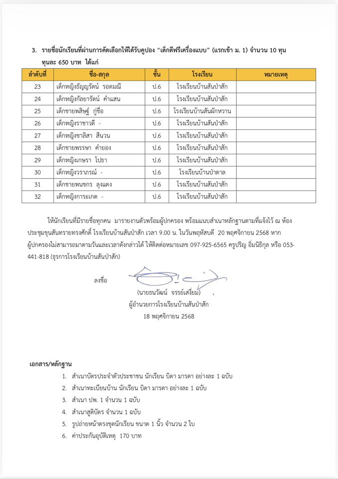 ให้นักเรียนที่มีรายชื่อทุกคนเตรียมเอกสารดังรายละเอียดแนบ มารายงานตัวพร้อมผู้ปกครอง ในวันพฤหัสบดี ที่ 20 พฤศจิกายน 2568 ณ ห้องประชุมขุนสันทรายทรงศักดิ์ โรงเรียนบ้านสันป่าสัก