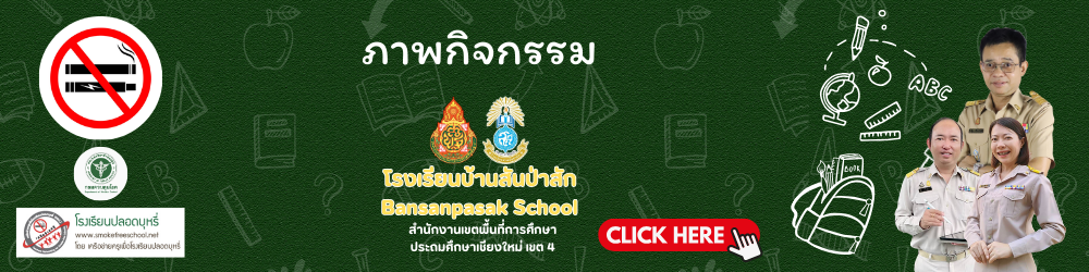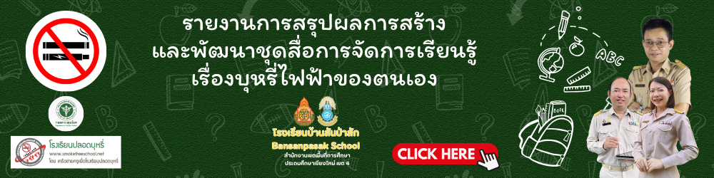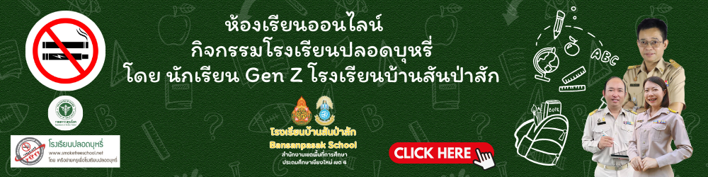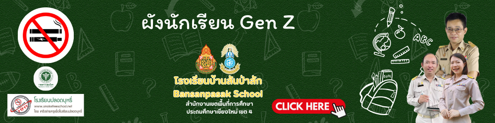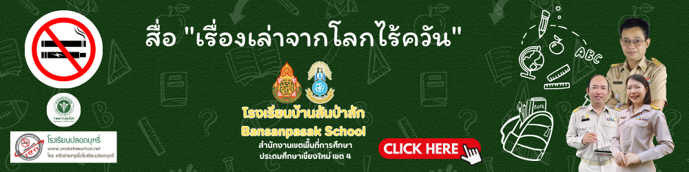 โรงเรียนปลอดบุหรี่และบุหรี่ไฟฟ้า นวัตกรรม “ Smart Reader Smart school, No smoke ( S3) กิจกรรมรักการอ่านต้านบุหรี่ สื่อ “เรื่องเล่าจากโลกไร้ควัน” รายงานการสรุปผลการสร้างและพัฒนาชุดสื่อการจัดการเรียนรู้เรื่องยุหรี่ไฟฟ้าของตนเอง ภาพกิจกรรม การดำเนินงาน โรงเรียนปลอดบุหรี่ 7 มาตรการปลอดบุหรี่ ผังนักเรียน Gen Z ห้องเรียนออนไลน์ กิจกรรมโรงเรียนปลอดบุหรี่ โดย นักเรียน Gen Z โรงเรียนบ้านสันป่าสัก